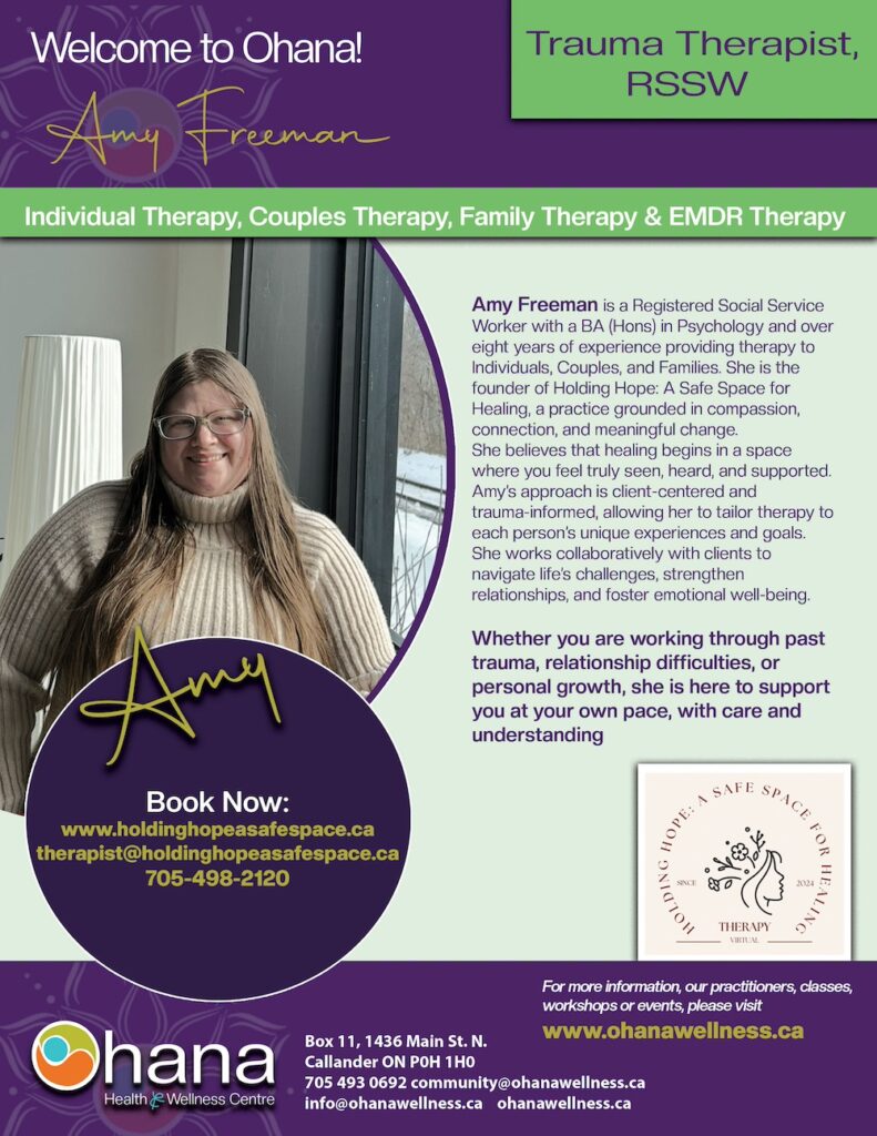 Amy Freeman is a Registered Social Service Worker with a BA (Hons) in Psychology and over eight years of experience providing therapy to individuals, couples, and families. She is the founder of Holding Hope: A Safe Space for Healing, a practice grounded in compassion, connection, and meaningful change.