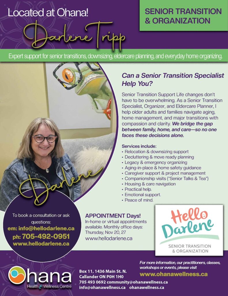 Over the past five years, Darlene’s business has grown and now provides part-time employment to others in the community while frequently collaborating with other senior care businesses. She has also seen an increase in demand for companionship services and elder care planning services, both locally and within Ontario. Services are offered both in person and virtually.
